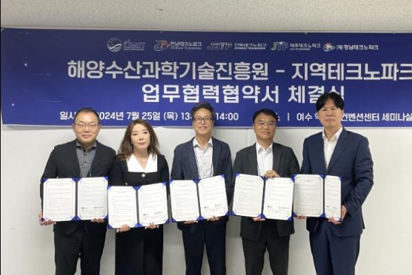 제주테크노파크와 해양수산과학기술진흥원이 지난 25일 여수엑스포컨벤션센터에서 제주 도내 기업의 혁신성장과 공공기술 활용을 촉진하기 위한 협약을 체결했다.