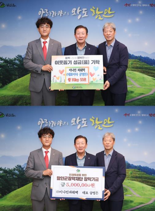 ㈜이나인파워텍은 26일 함안군장학재단에 지역인재 육성을 위한 장학기금 500만 원과 함안군 어려운 이웃을 돕기 위한 쌀(10kg) 50포(120만?원?상당)를 함안군에 기탁했다.
