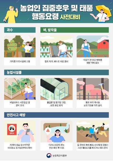 송미령 농식품부 장관은 “유관기관과 지자체 등 모든 기관이 특별점검을 실시하여 인명과 재산피해가 최소화되도록 적극 노력할 계획”이라고 밝히며, “농업인도 피해가 없도록 태풍·호우 대비 농작물 및 농업시설물 피해 예방 안전관리요령을 사전에 숙지하고 준수해 줄 것”을 당부했다.