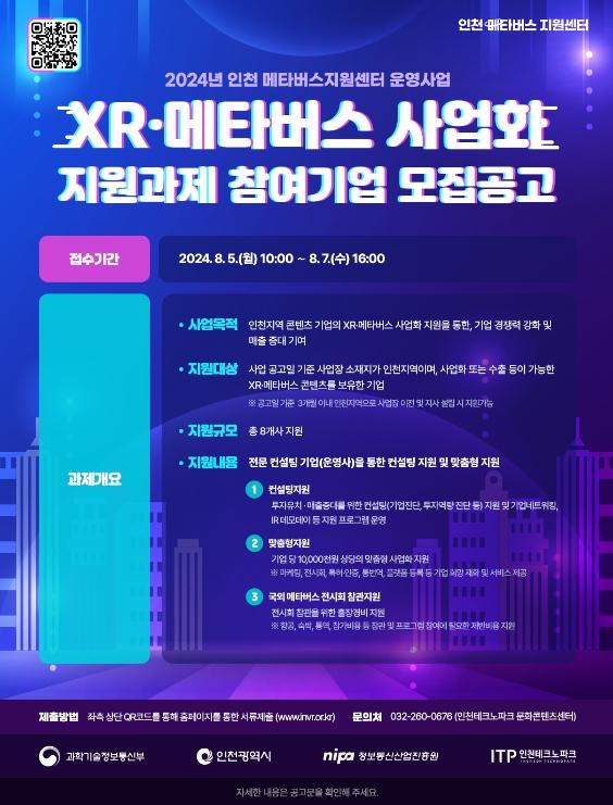총 8개 사를 모집하며, 지원신청은 8월 7일 16시까지 인천 메타버스 지원센터 누리집을 통해 접수한다.