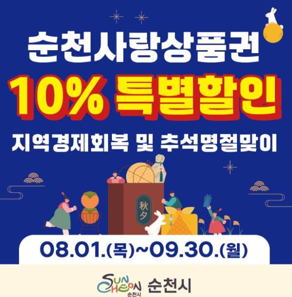 순천시는 오는 8월 1일부터 9월 30일까지 순천사랑상품권 10% 특별할인판매를 실시한다고 밝혔다.