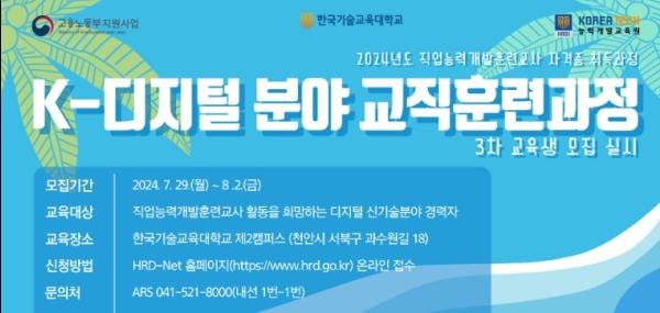 고용노동부 한국기술교육대학교 부설 능력개발교육원은 2024년 제3차 직업능력개발훈련교사 K-디지털 분야 교직훈련과정 교육생 50명을 7월 29일부터 8월 2일까지 모집한다.