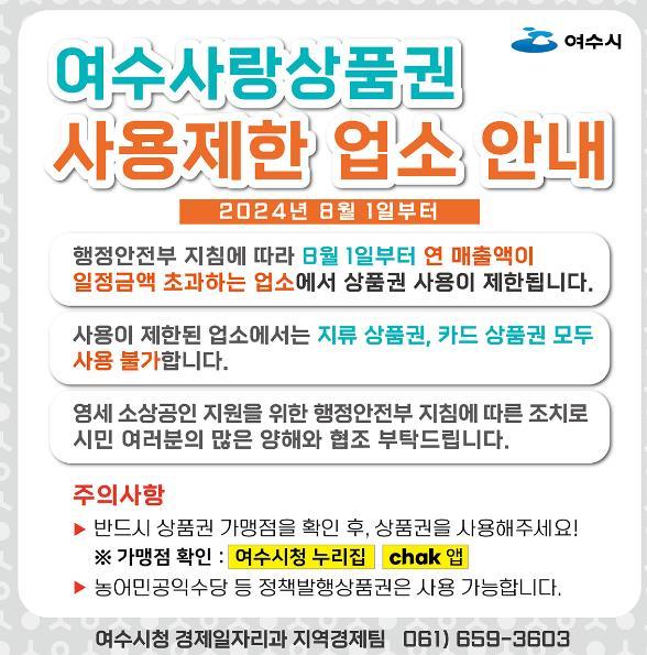 여수시가 오는 8월 1일부터 일부 가맹점에 대해 여수사랑상품권 사용을 제한한다고 29일 밝혔다.