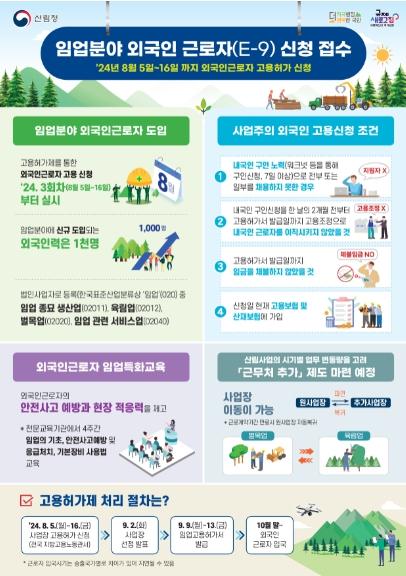 고용허가 신청은 오는 8월 5일부터 16일까지 ‘고용24’ 또는 외국인 고용관리시스템 누리집에서 가능하며 처음 신청하는 사업장은 정보 확인 및 등록을 위해 관할 지방고용노동청에 직접 방문해야 한다.