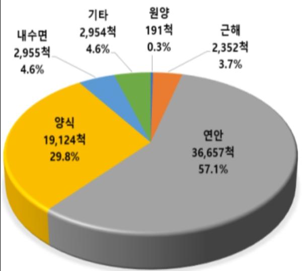 어업 종류별로는 연안어선이 36,657척, 57.1%로 가장 많았고, 어선 규모별로는 5톤 미만 어선이 50,912척으로 79.3%를 차지했다. 어선 재질별로는 섬유강화플라스틱(FRP)으로 만들어진 어선이 62,220척, 96.9%로 대부분을 차지하고 있다.