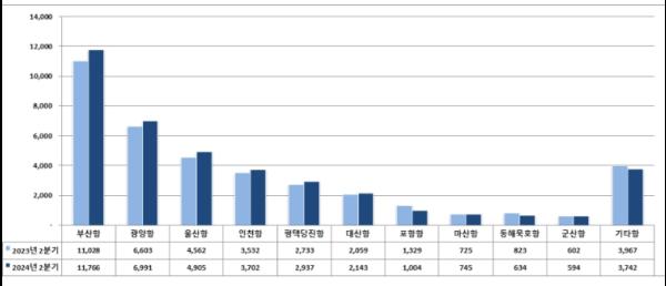 항만별로 보면 부산항, 광양항, 울산항, 인천항은 전년 동기 대비 각각 6.7%, 5.9%, 7.5%, 4.8% 증가했다.