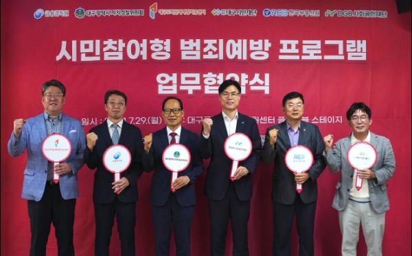 대구광역시 자치경찰위원회는 7월 29일 대구콘텐츠기업지원센터에서 금융감독원 대구경북지원, 대구도박문제예방 치유센터, 대구시민재단, 한국부동산원, DGB사회공헌재단과 함께 ‘시민참여형 범죄예방 프로그램’ 운영을 위한 업무협약을 체결했다.