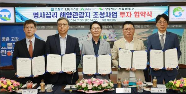 30일 고창군에 따르면 이날 오후 2시 고창군청 대회의실에서 국내 기업 4곳((주)LIG시스템, ㈜P&K INC, 영풍제약, 서울경제TV)과 3000억원 상당의 ‘명사십리 해양관광지 조성사업 투자협약식’이 열렸다.