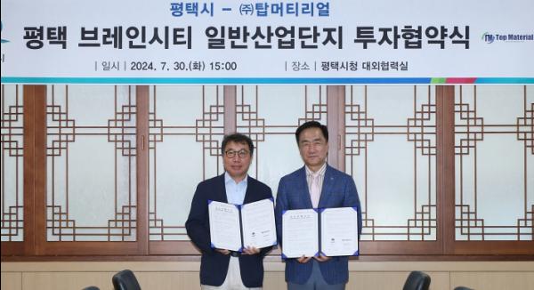 평택시는 이차전지 소재 부품 제조기업인 ㈜탑머티리얼(대표 노환진)과 500억원 규모의 투자협약을 30일 체결했다고 밝혔다.