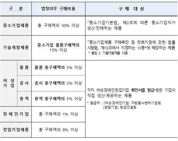 ‘중소기업제품 구매목표비율제도’는 국가기관, 지방자치단체, 공공기관 등이 중소기업제품의 안정적인 판로 확보와 구매 활성화를 위해 매년 일정비율(중소기업제품 50%, 장애인기업제품 1%, 여성기업제품의 물품·용역 5%, 공사 3%, 기술개발제품 15%, 창업기업제품 8%) 이상으로 중소기업제품을 구매토록 하는 기준이다.