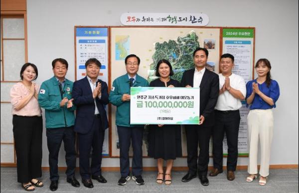 유희태 완주군수는 “고향을 사랑하는 마음으로 고액을 선뜻 기부해 주신 ㈜열매마을 강중경 대표께 진심으로 감사하다”며 “완주군에서도 수해민들의 조속한 일상 회복을 위해 최선을 다하겠다”고 말했다.