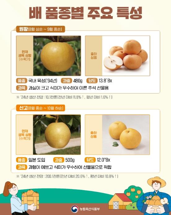 나주원예농협 농산물산지유통센터(APC)를 찾은 송미령 장관은 햇배가 선별·포장 후 출하되는 과정을 지켜보며 “올해 작황이 좋아 생산도 전년보다 20% 가량 늘어날 것으로 전망된다. 8월 중순부터 신고 품종이 본격적으로 출하되면 시장 공급도 충분해져 가격도 안정될 것으로 보인다.”라며, “배는 사과와 함께 우리나라 과일 중 연중 소비되는 대표 과일인데, 지난해 생산감소로 지금까지 가격이 높았다. 원황이 출하되기 시작한 만큼 산지저장·유통시설에서도 꾸준한 출하가 이루어질 수 있도록 현장에서 각별히 신경써 줄 것”을 당부했다.