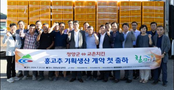 청양군은 지난 31일 치킨 브랜드 매출 1위 기업 교촌치킨과 청양고추 납품 계약재배를 실시하고 청양농협 집하장에서 첫 출하식을 진행했다.