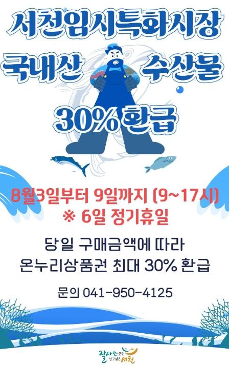 서천군은 오는 3일부터 9일까지 서천임시특화시장에서 국내산 수산물을 구매하면 구매금액에 따라 당일 최대 30% 환급해준다.