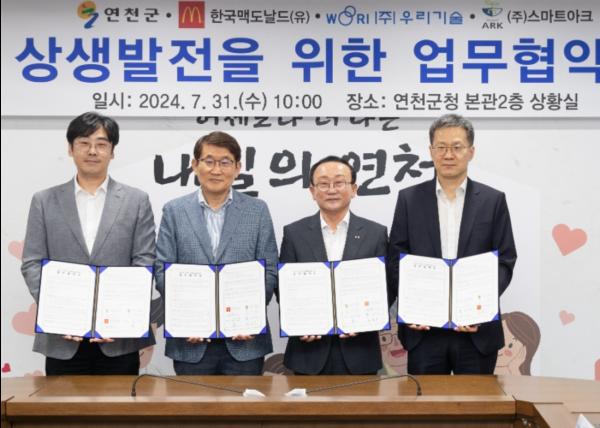 연천군은 지난달 31일 군청 본관 2층 상황실에서 한국맥도날드(유), ㈜우리기술, ㈜스마트아크와 농산물 유통 활성화 등 상생 발전을 위한 업무협약을 체결했다고 밝혔다.