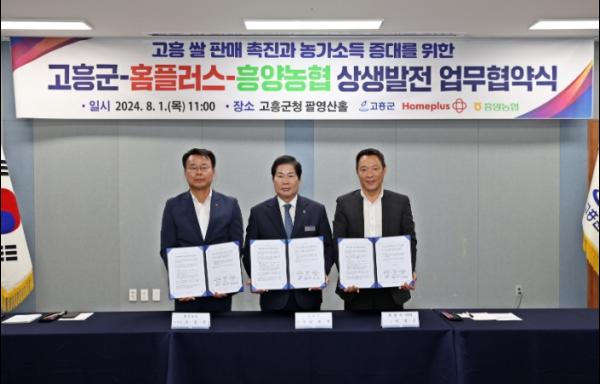 고흥군공영민)은 1일 군청 팔영산홀에서 국내 최고 유통업체인 홈플러스와 흥양농협이 함께 고흥 쌀 판매 촉진과 농가 소득증대를 위한 3자 업무협약을 체결했다고 밝혔다.
