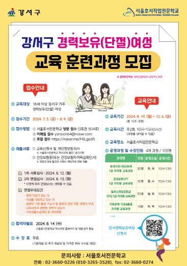 대상은 강서구에 거주하는 18세 이상 경력 보유 여성 중 취·창업을 희망하는 사람으로 서울호서직업전문학교에서 진행된다.