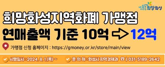 화성시가 8월부터 희망화성지역화폐 가맹점 연 매출 제한 기준을 10억 원에서 12억 원으로 상향한다.