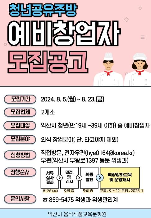 익산시 음식식품교육문화원은 오는 5일부터 23일까지 '제2기 청년공유주방' 예비창업자를 모집한다.