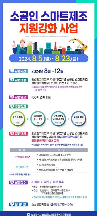 인천광역시는 ‘2024년 소공인 스마트제조 지원강화 사업’ 추진에 따른 지원 업체를 8월 23일까지 모집한다.