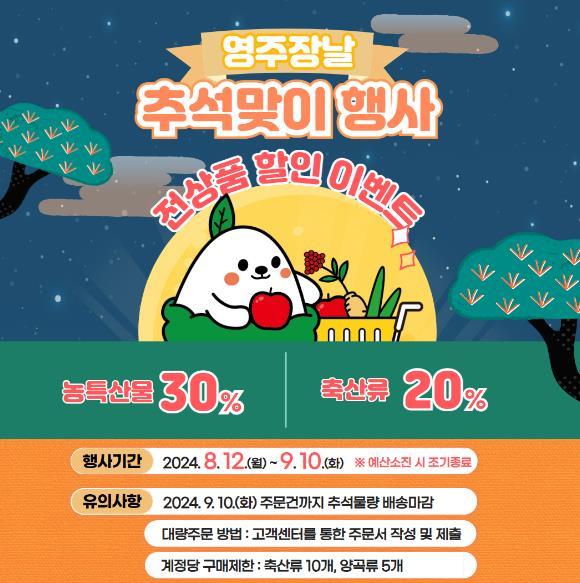 영주시는 오는 12일부터 9월 10일까지 공식 농특산품 온라인 쇼핑몰 ‘영주장날’에서 추석맞이 전 상품 할인 행사를 진행한다.
