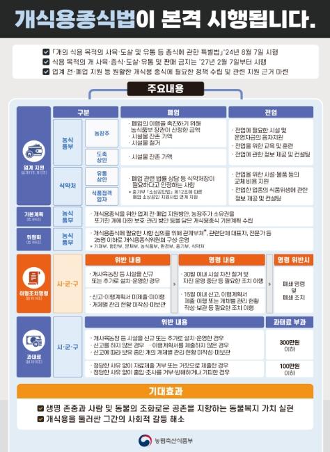 농림축산식품부는 국무회의 의결을 거친 '개의 식용 목적의 사육·도살 및 유통 등 종식에 관한 특별법 시행령안'이 8월 7일 시행된다고 밝혔다.