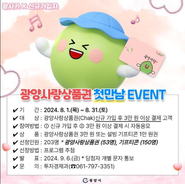 광양시가 광양사랑상품권 신규가입자 유입을 위해 8월 1일부터 31일까지 한 달간 이벤트를 진행한다.