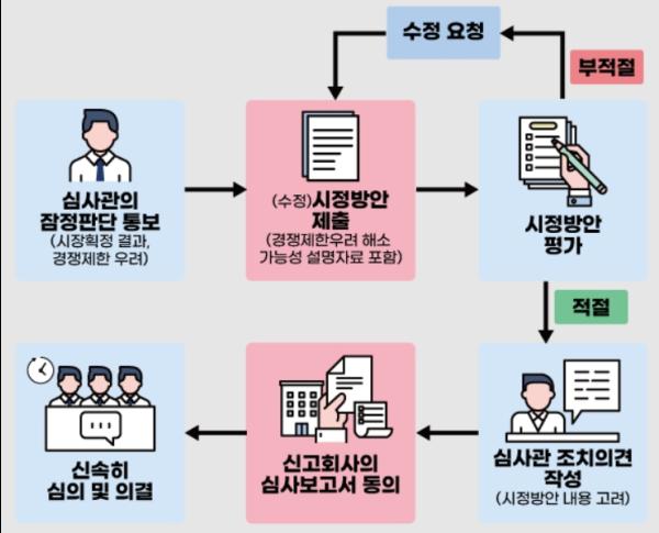 지금까지는 공정위가 경쟁제한적 기업결합에 대한 시정조치를 직접 설계하여 부과해왔으며, 독과점 우려가 매우 큰 경우는 기업결합 금지조치도 부과해왔다. 8월 7일부터는 시정조치를 부과함에 있어 시장 정보를 풍부히 보유한 기업에게 경쟁제한 우려 시정방안을 제출할 수 있는 기회를 부여하고, 제출된 방안을 고려하여 공정위가 시정조치를 부과하는 방식도 추가된다. 이러한 시정방안 제출제도는 다음과 같은 절차로 운영된다.