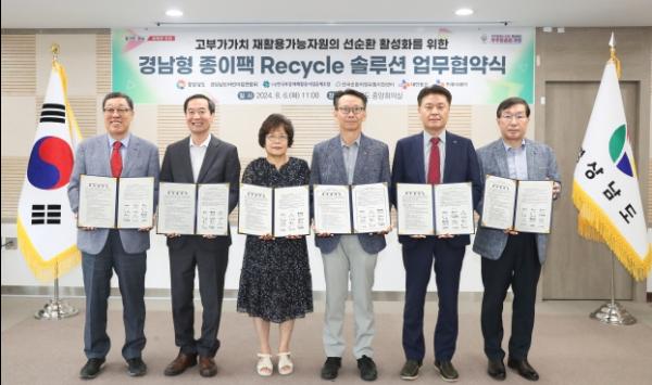 경상남도는 6일 오전 11시 경남도청 중앙회의실에서 5개 민?관 기관과 함께 ‘경남형 종이팩 Recycle 솔루션 동행 프로젝트’ 업무협약을 체결했다고 밝혔다.
