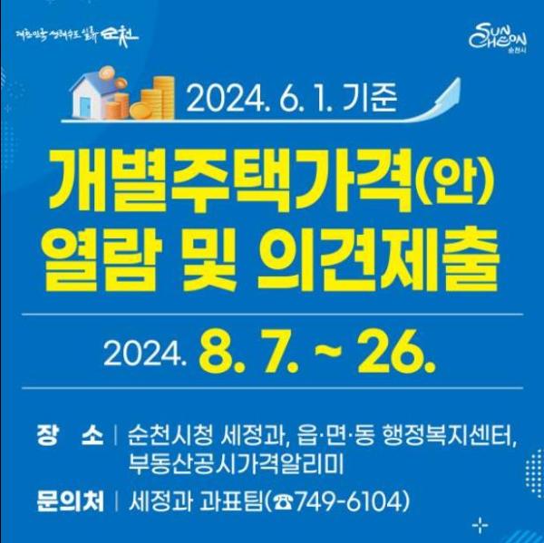 열람은 순천시 누리집과 부동산공시가격알리미에서 가능하며, 가격에 의견이 있는 소유자 등은 의견제출 기간 내 순천시청 세정과 또는 각 읍면동 행정복지센터에 의견을 제출하면 된다.