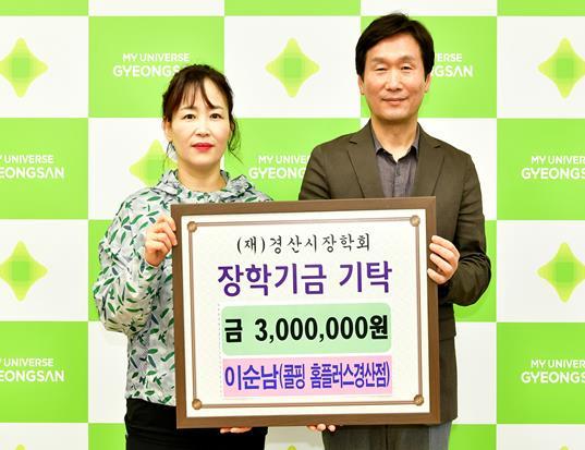 (재)경산시장학회는 7일 이순남 대표(콜핑 홈플러스 경산점)가 인재 육성을 위한 장학금 300만원을 기탁했다고 밝혔다.