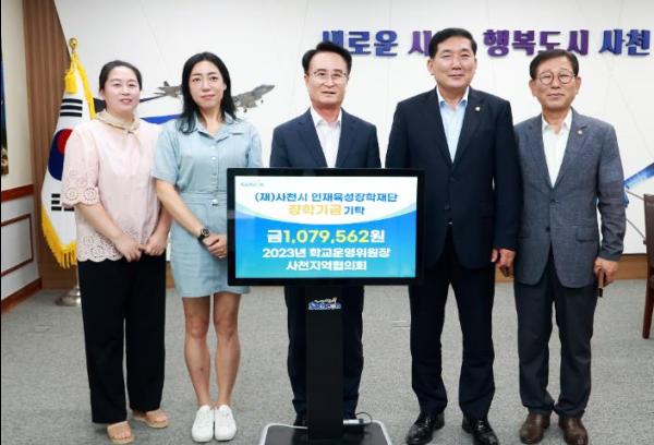 ‘2023년 학교운영위원장 사천지역협의회’는 지난 7일 사천시 인재육성장학재단에 지역 인재 육성을 위한 장학금 1,079,562원을 기탁했다.