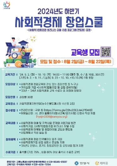 안양시가 오는 9월부터 10월까지 ‘하반기 사회적경제 창업스쿨’을 운영하고, 교육생을 이달 22일까지 모집 중이라고 7일 밝혔다.