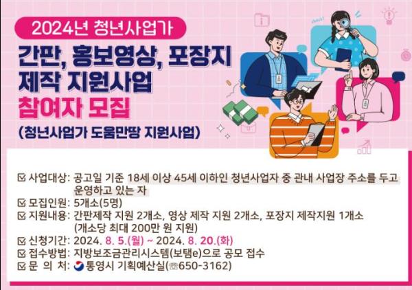 통영시에서는 청년 사업자(18세부터 45세)를 대상으로 하여 8. 5.부터 8. 20. 까지 간판개선, 홍보영상, 포장지 지원 사업에 참가할 청년 사업자를 모집한다고 밝혔다.