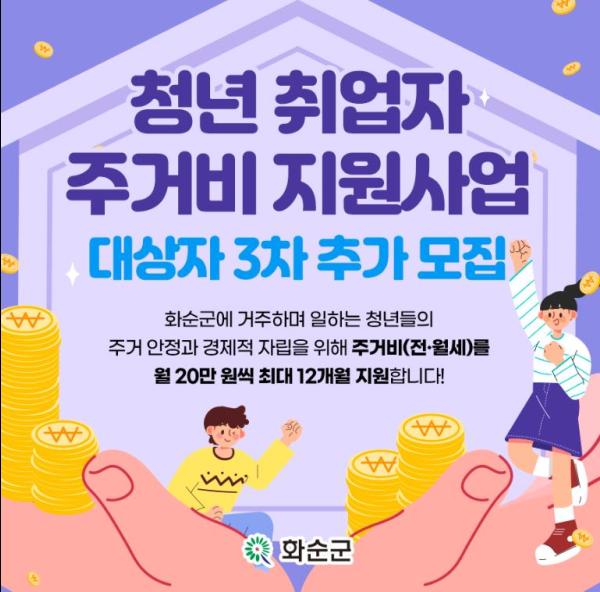 화순군은 8일 ‘청년 취업자 주거비 지원사업’ 대상자 9명을 오는 12일부터 23일까지 추가 모집한다고 밝혔다.