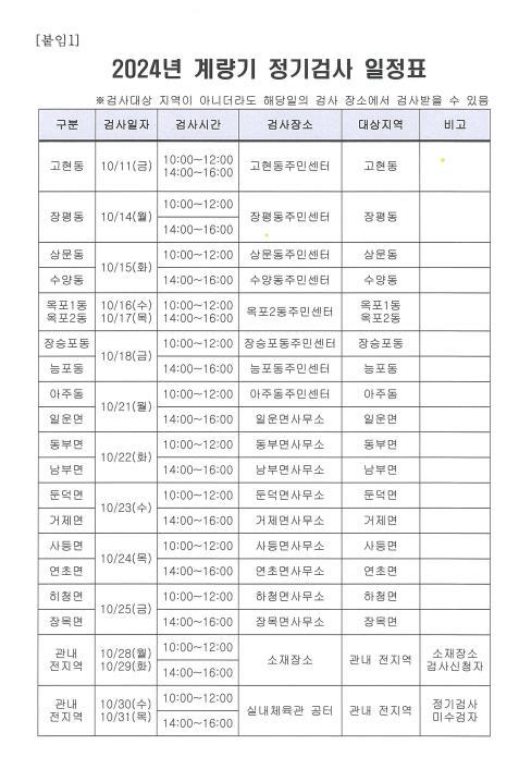 시는 일정표에 따라 10월 11일 고현동주민센터를 시작으로 지정된 검사장소를 순회하며 검사를 실시할 계획이다.