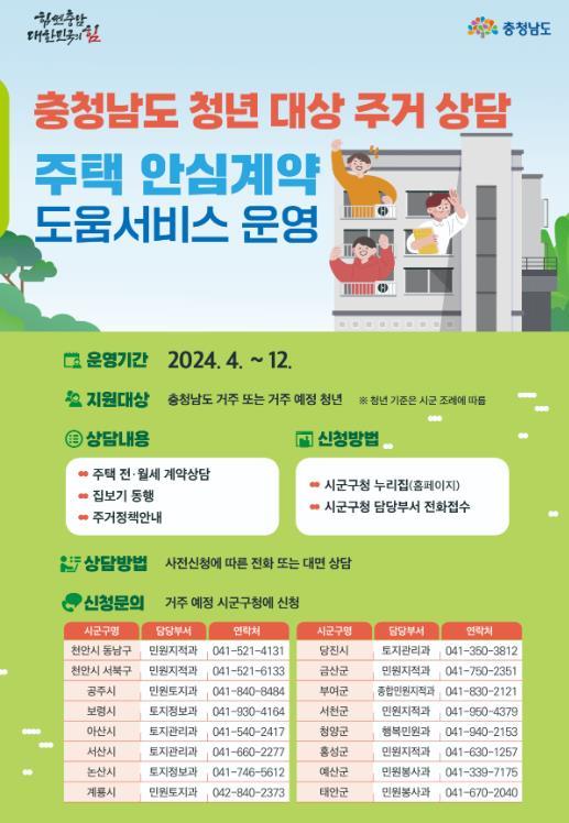 ‘주택 안심계약 도움서비스’는 부동산 임차 계약 관련, 청년들의 안정적인 지역 정착과 주민 복지 향상에 기여하고 경험과 지식이 부족한 청년들이 안심하고 청양군에 거주할 수 있도록 하기 위한 도움서비스이다.