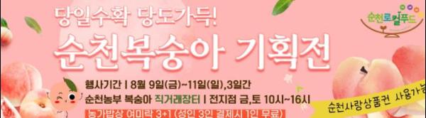 순천로컬푸드(주)는 8월 9일부터 8월 11일까지 3일간 로컬푸드 직매장 3곳(순천만국가정원점, 조례호수공원점, 신대점)에서'순천로컬푸드 복숭아 기획전'을 개최한다고 밝혔다.