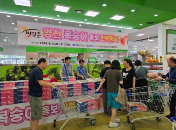 영천시와 영천시조합공동사업법인이 함께 추진한 이번 판촉행사는 신선한 영천 복숭아를 맛볼 수 있는 시식행사와 특별 할인판매 등 다양한 이벤트를 진행해 달고 아삭한 영천 복숭아를 서울 시민에게 홍보한다.