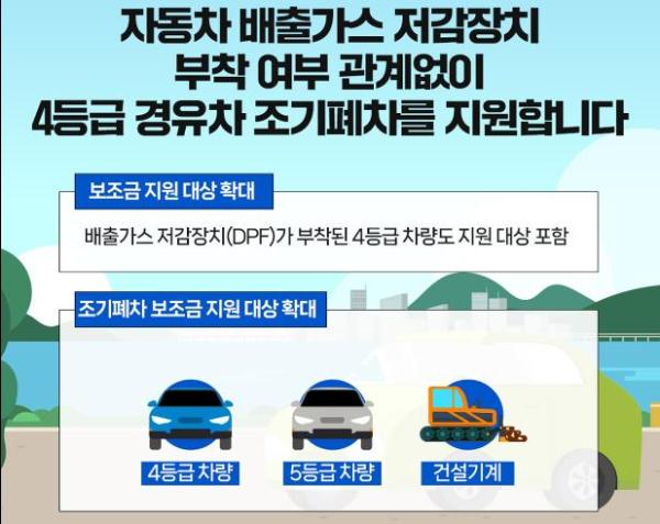 한편, 올해부터는 그간 지원에서 제외됐던 매연저감장치(DPF)가 부착된 4등급 경유차도 조기폐차 지원 대상에 포함됐다.