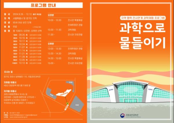 이번 프로그램은 단순한 관람이 아니라 나이든 장년(시니어)들이 직접 체험하면서 과학과 더욱 친숙해 질 수 있도록 기획했으며, 한국과학문명관의 소리와 도량형의 기준이 되는 ‘황종율관’, 과학탐구관의 소리가 반사하고 굴절하는 현상을 이용한 ‘소리를 담는 접시’, 첨단기술관의 태양빛으로 전기를 만드는 원리를 배우는 ‘태양광자동차’ 등 상설전시관 전시물과 연관된 만들기 체험 등으로 구성된다.