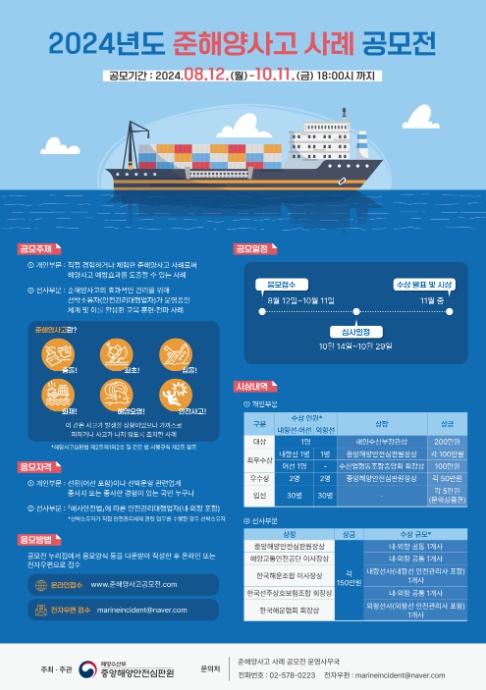 해양수산부 중앙해양안전심판원은 준해양사고 사례를 발굴하여 실제 사고를 예방하는 데 활용하기 위해 8월 12일부터 10월 11일까지 ‘2024년도 준해양사고 사례 공모전’을 개최한다고 밝혔다.