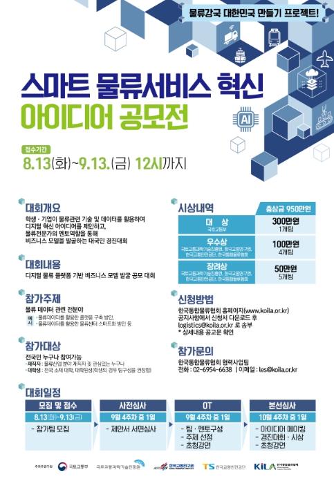 국토교통부는 물류산업의 다양한 데이터를 활용한 혁신 비즈니스 모델을 발굴하기 위해 ‘스마트 물류 서비스 혁신 아이디어 공모전’을 8월 13일부터 11월 1일까지 진행한다.
