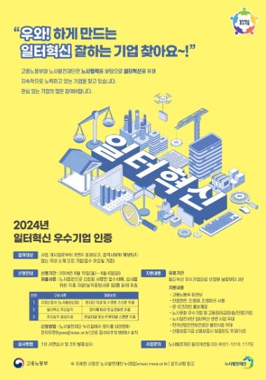 노사발전재단(사무총장 김대환)은 노사협력을 바탕으로 일터혁신을 위해 지속적으로 노력하고 있는 기업을 발굴·인증하여 대한민국에 일터혁신 문화가 확산 되도록 8월 12일부터 9월 6일까지 30일간 ‘2024년 일터혁신 우수기업 인증’ 기업 모집을 시작한다.