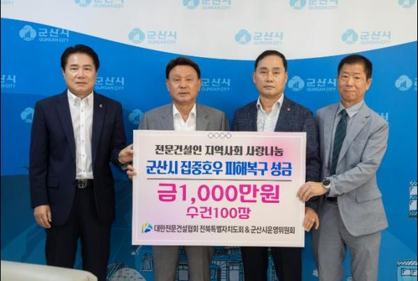 12일 대한전문건설협회 전라북도회 · 군산시협의회는 집중호우 피해를 입은 저소득 가구와 사회복지시설의 신속한 복구 지원을 위해 성금 1천만원과 100만원 상당의 타올을 군산시에 기탁했다.