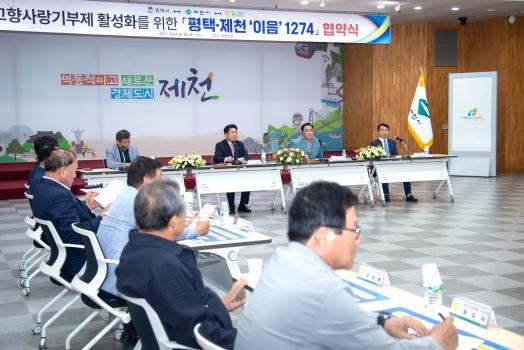 제천시는 자매결연도시인 평택시, NH농협과 함께 고향사랑기부제 활성화로 지역경제 발전을 위한'제천·평택 이음 1274'협약식을 진행한다.