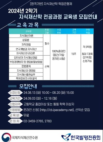 특허청 국제지식재산연수원은 8월 13일부터 20일까지 ’24년 2학기 지식재산학 학점은행 온라인 수강생을 모집한다.
