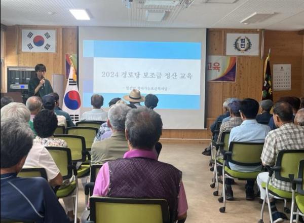 법전면은 지난 9일 면사무소 회의실에서 2024년 노인지도자 순회교육을 위해 참석한 관내 27개 경로당 회장과 총무를 대상으로 경로당 보조금 교육을 실시했다.