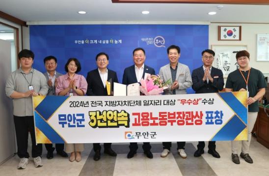 전남 무안군이 고용노동부 주관 ‘2024년 전국 지방자치단체 일자리대상 시상식’에서 일자리 공시제 부문에서 3년 연속 우수 자치단체 표창의 성과를 거뒀다.