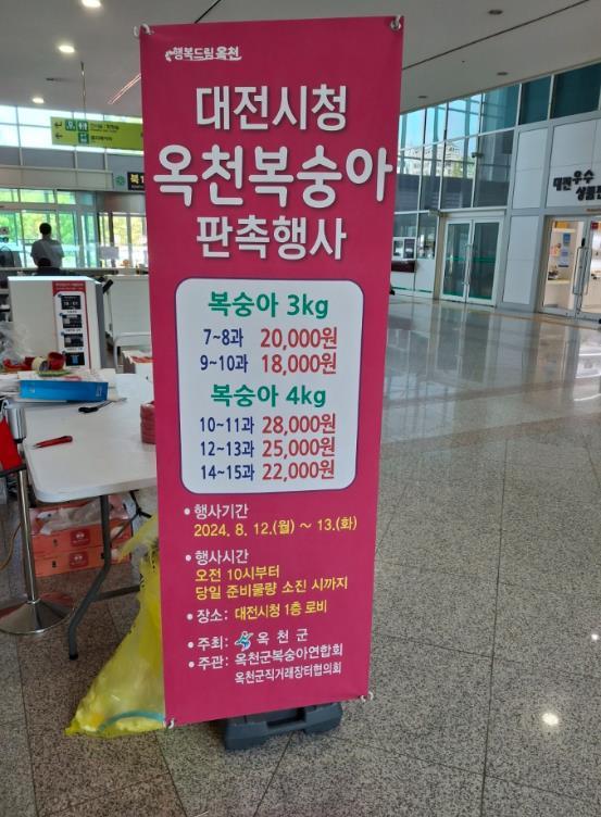 옥천군은 옥천 복숭아의 우수성 홍보와 안정적 판로확보를 위해 12일, 13일 대전시청 1층 로비에서 판촉 행사를 진행했다.